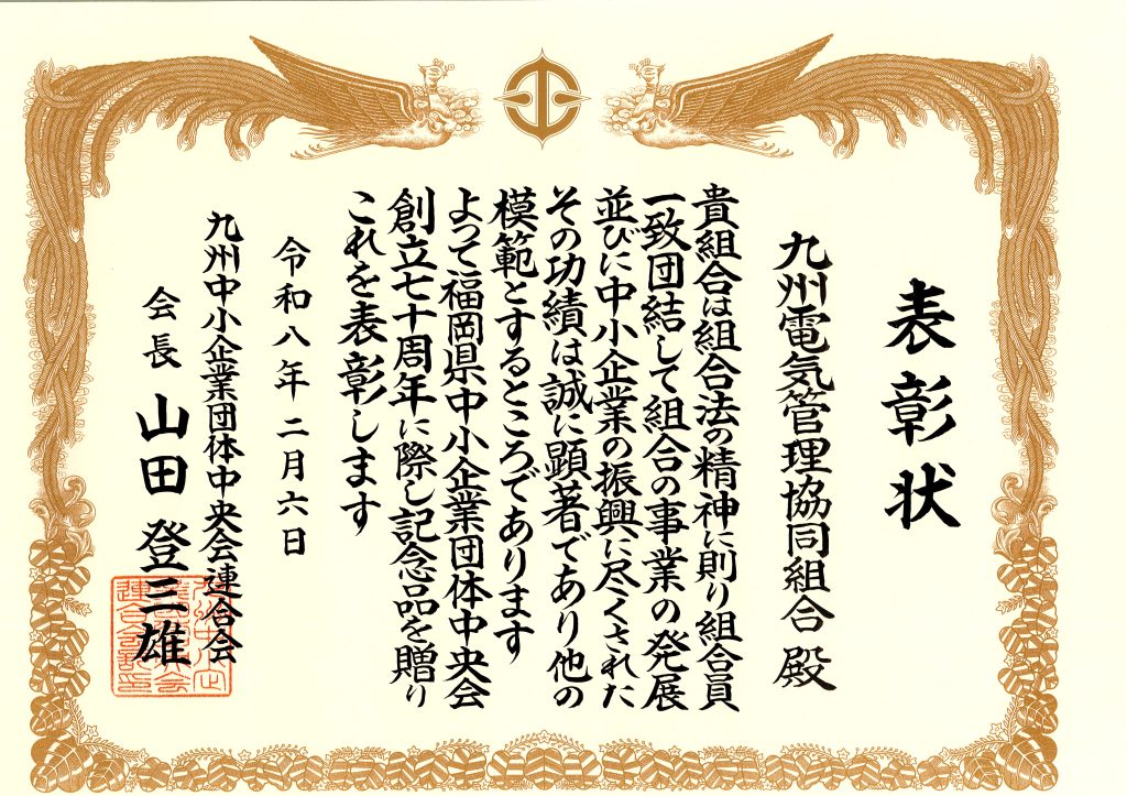 2026.02.12 九州中小企業団体中央会連合会 会長表彰 この度 令和8年2月日6日 九州中小企業団体中央会連合会 会長表彰 にて 優良組合として九州電気管理協同組合が表彰を受けました。 今回の受賞を励みに、今後もより良い組合運営を目指し邁進してまいりますので、 引き続きご愛顧賜りますよう、よろしくお願い申し上げます。